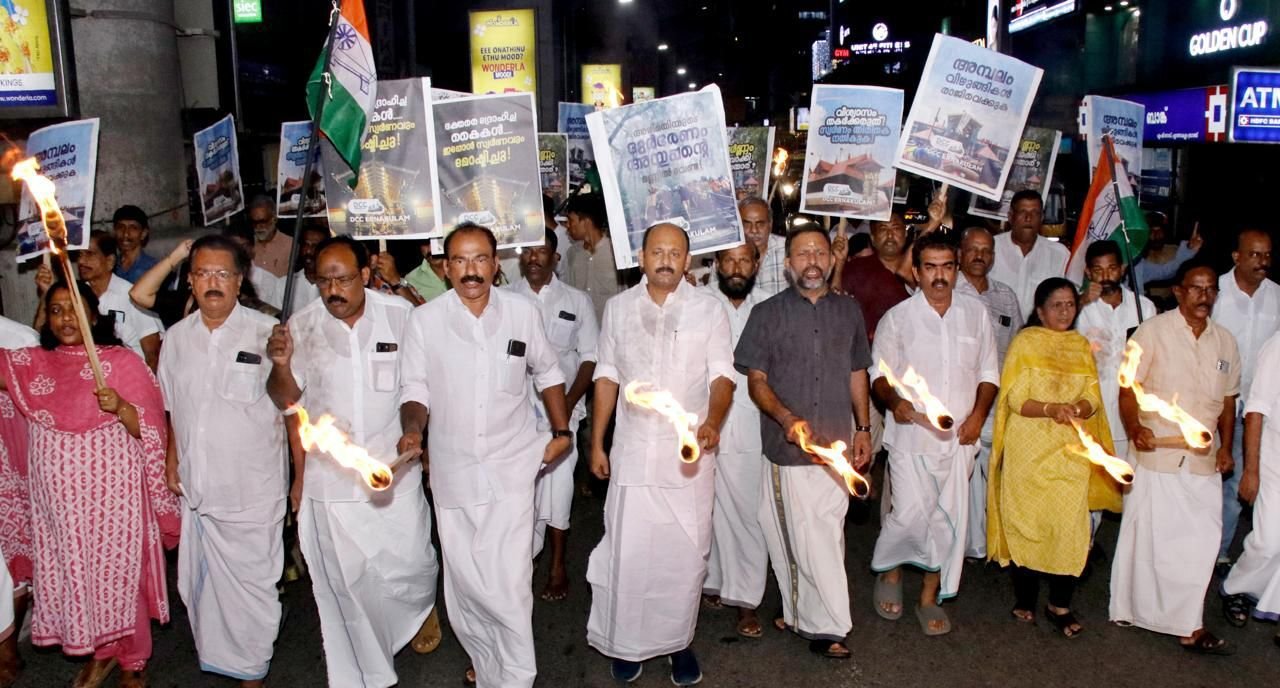 കൊച്ചി: ശബരിമല ക്ഷേത്രത്തില് സംഭാവനയായി ലഭിച്ച സ്വര്ണം ചെമ്പെന്ന പേരില് കടത്തിയ സംഭവത്തില് സര്ക്കാരിനെതിരെ പ്രതിഷേധ പന്തം കൊളുത്തി കോണ്ഗ്രസ്. ജില്ലയിലെ 130 കേന്ദ്രങ്ങളിലാണ് പ്രതിഷേധം നടന്നത്. ക്ഷേത്രത്തിന് ലഭിച്ച സ്വര്ണത്തെ ചെമ്പെന്ന വ്യാജേന കടത്തിയതിന് പിന്നില് ഉന്നതര്ക്ക് പങ്കുണ്ടെന്നും, ദേവസ്വം വകുപ്പ് മന്ത്രിയും, ബോര്ഡ് പ്രസിഡന്റും തല്സ്ഥാനം രാജിവെക്കണമെന്നും ഡിസിസി പ്രസിഡന്റ് മുഹമ്മദ് ഷിയാസ് പറഞ്ഞു. സ്വര്ണത്തെ ചെമ്പാക്കുന്ന ദേവസ്വം ബോര്ഡിന്റെ രസതന്ത്രത്തിന് നോബല് സമ്മാനം നല്കണമെന്ന് അദ്ദേഹം പരിഹസിച്ചു.